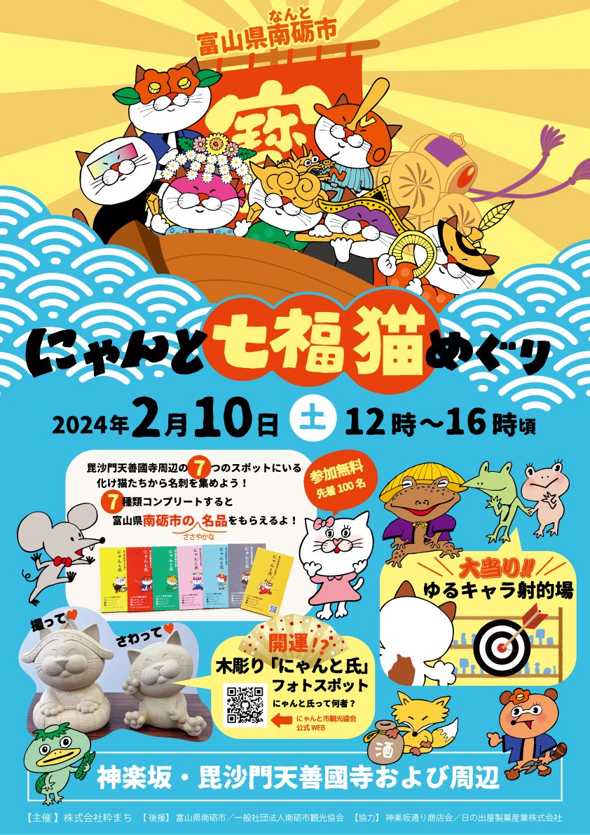 富⼭県南砺市公認の南砺市地域おこし協⼒猫「にゃんと氏」と、神楽坂 化け猫フェスティバルがコラボレーションした「にゃんと七福猫めぐり」が神楽坂で開催されます。
