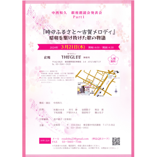 | Frais de participation | ticket 入場無料 ※受付時ドリンク代別途500円のお支払いをお願いしております お申込みは下記メールアドレスにおねがいいたします。 roudoku23@gmail.com |