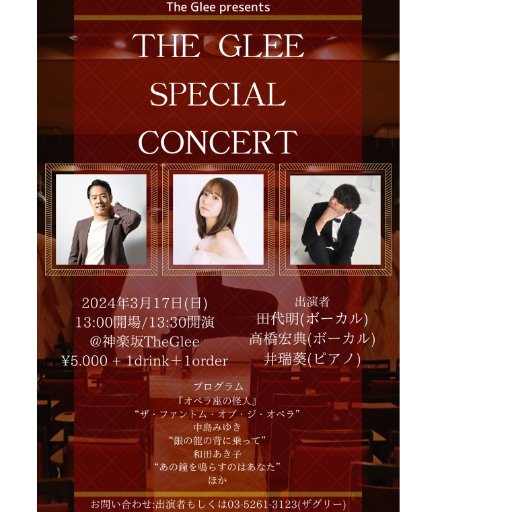 | Lieu | THE GLEE/〒162-0825 東京都新宿区神楽坂3丁目4 AYビル B1F、東京メトロ(東西線・有楽町線・南北線・大江戸線)飯田橋駅B3出口より徒歩3分、JR総武線飯田橋駅西口より徒歩4分 |