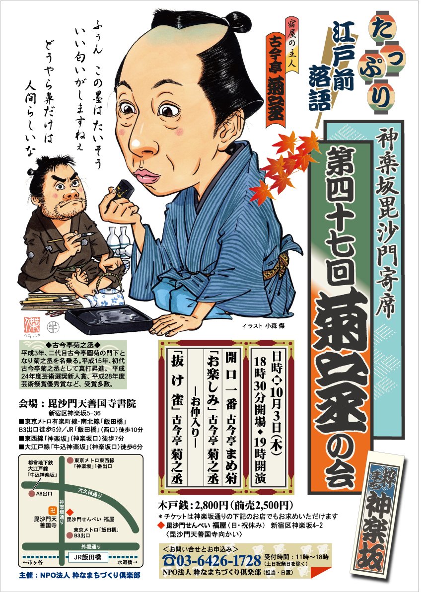 | Lieu | 神楽坂 毘沙門天 善国寺書院 神楽坂5-36 JR飯田橋駅、西口 徒歩10分 有楽町線飯田橋駅 B3出口 徒歩5分 東西線神楽坂駅(神楽坂口) 徒歩7分 大江戸線牛込神楽坂駅 A3出口 徒歩6分 |