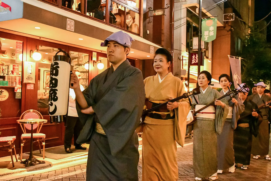 石畳の路地に迷い込むと聞こえてくる三味線の音色。偶然のように出逢う“流しの芸能”。地元神楽坂在住で新内節の人間国宝・鶴賀若狭掾(わかさのじょう)一門による粋な姿の「新内流し」が、神楽坂の路地や横丁を流します。哀愁漂う曲調に静かに耳を傾けてみてください。