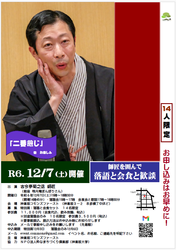 神楽坂コモンズ1st主催、古今亭菊之丞師匠をお招きし、師匠を囲んで落語と歓談と会食を楽しんで頂ける、人数限定の特別席のご案内です。