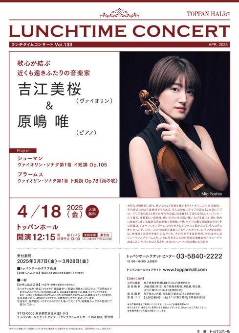 〈ランチタイムコンサート Vol.133〉吉江美桜(ヴァイオリン)&原嶋 唯(ピアノ)【入場無料/受付終了】