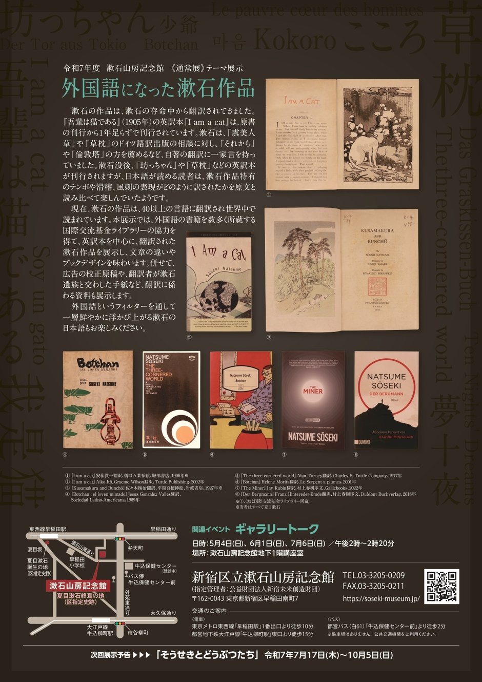 | Contact | 新宿区立漱石山房記念館 〒162-0043 新宿区早稲田南町7 電話 : 03-3205-0209 FAX : 03-3205-0211 |