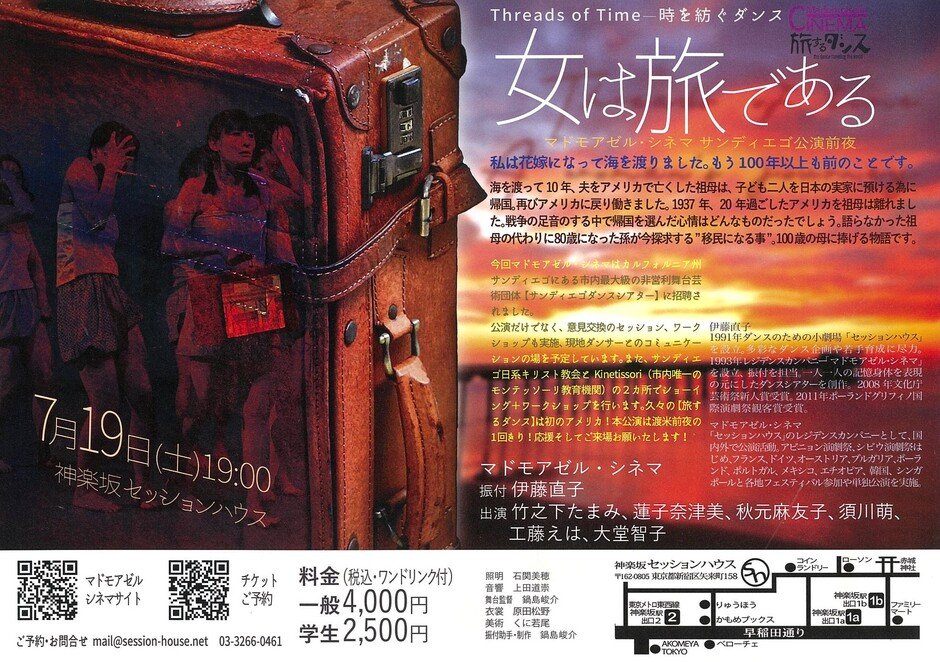 公演だけでなく、 意見交換のセッション、ワーク ショップも実施、現地ダンサーとのコミュニケーションの場を予定しています。 また、サンディエゴ日系キリスト教会と Kinetissori (市内唯一の モンテッソーリ教育機関)の2ヵ所でショーイング+ワークショップを行います。 久々の【旅するダンス】は初のアメリカ! 本公演は渡米前夜の1回きり! 応援そしてご来場お願いたします!