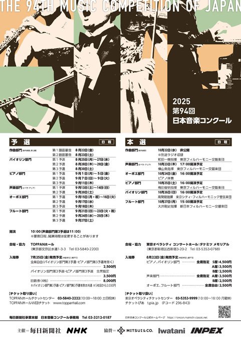 | Contact | [主催]毎日新聞社 NHK [協賛]三井物産株式会社/岩谷産業株式会社/株式会社INPEX [会場協力]TOPPANホール [チケットのお申し込み] TOPPANホールチケットセンター 03-5840-2222(平日10:00~18:00) [日本音楽コンクールに関するお問い合わせ] ■毎日新聞社事業本部内 日本音楽コンクール事務局 03-3212-0187(平日10:00~18:00) ■予選開催日事務局 080-8469-7612 ■公式WEBサイト https://oncon.mainichi-classic.net/ |