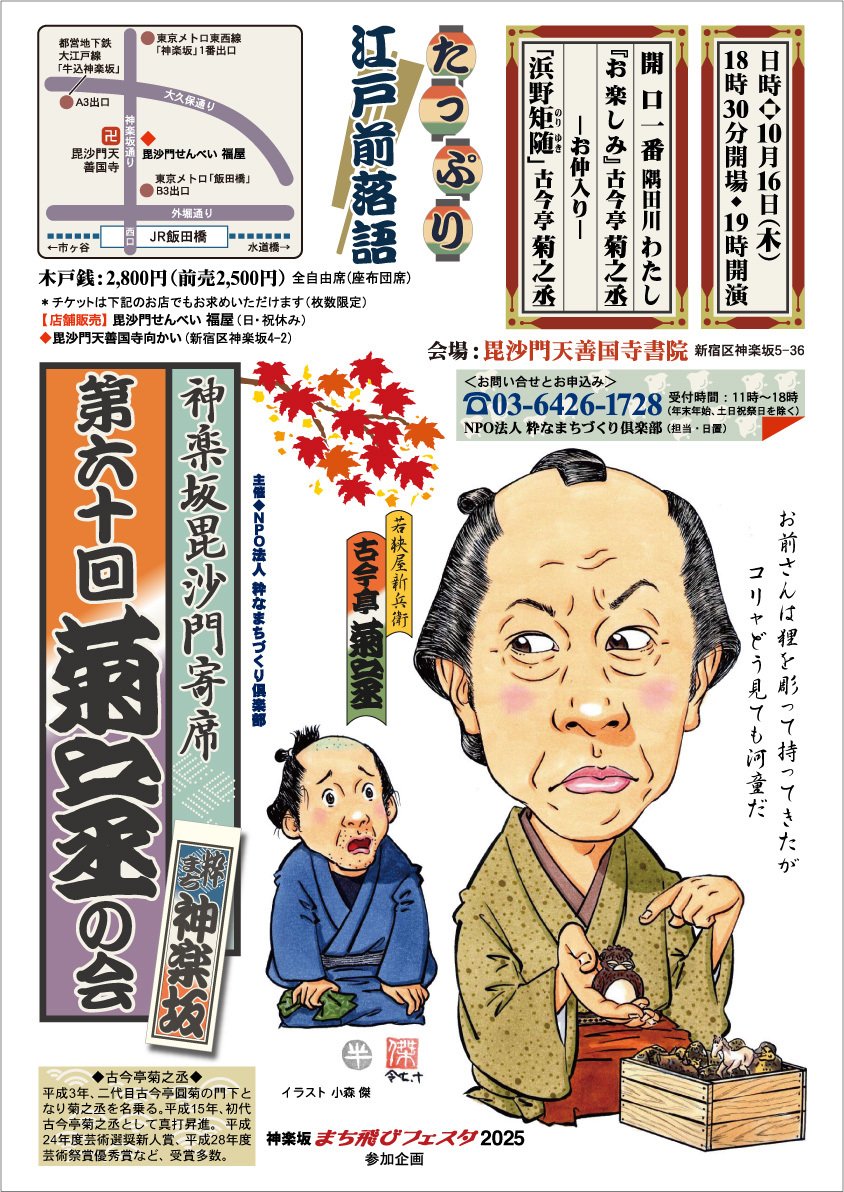 | Lieu | 神楽坂 毘沙門天 善国寺書院 (神楽坂5-36) JR飯田橋駅、西口 徒歩10分 有楽町線飯田橋駅 B3出口 徒歩5分 東西線神楽坂駅(神楽坂口) 徒歩7分 大江戸線牛込神楽坂駅 A3出口 徒歩6分 |