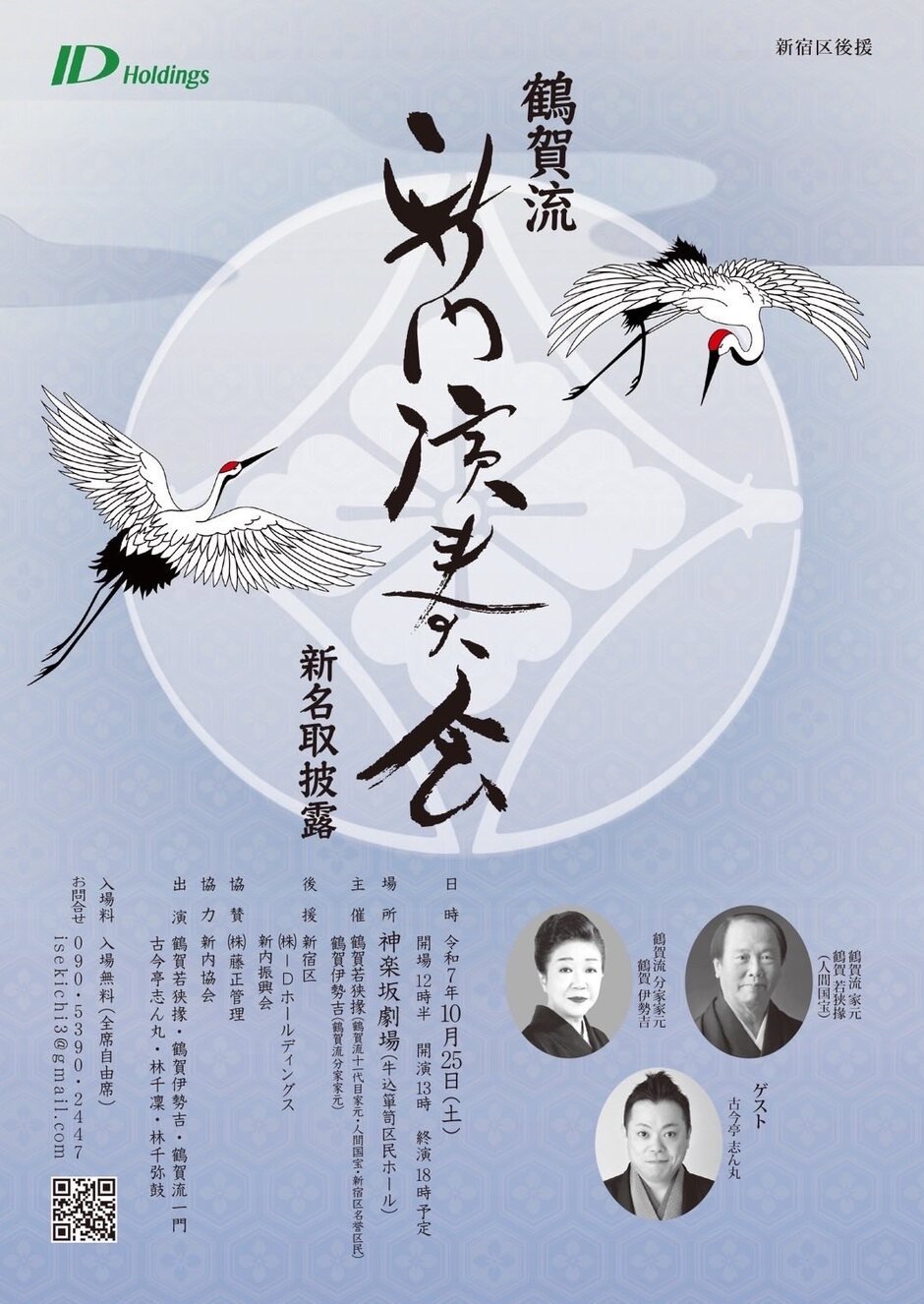| Contact | 鶴賀若狭掾 稽古場: 162-0825 東京都新宿区神楽坂6-27 問い合わせ先: 鶴賀伊勢吉 TEL:090-5390-2447 isekichi3@gmail.com |