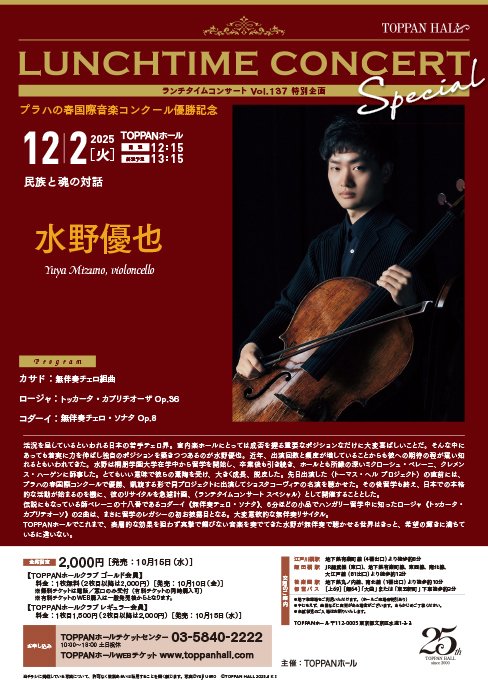 〈ランチタイムコンサート Vol.137 特別企画〉水野優也(チェロ)