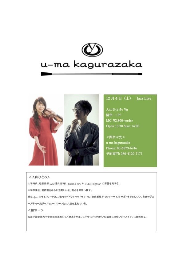 | Contact | Email:u.ma.kagurazaka@gmail.com Phone: 03-6873-6746 Mobile: 080-4120-7171 |