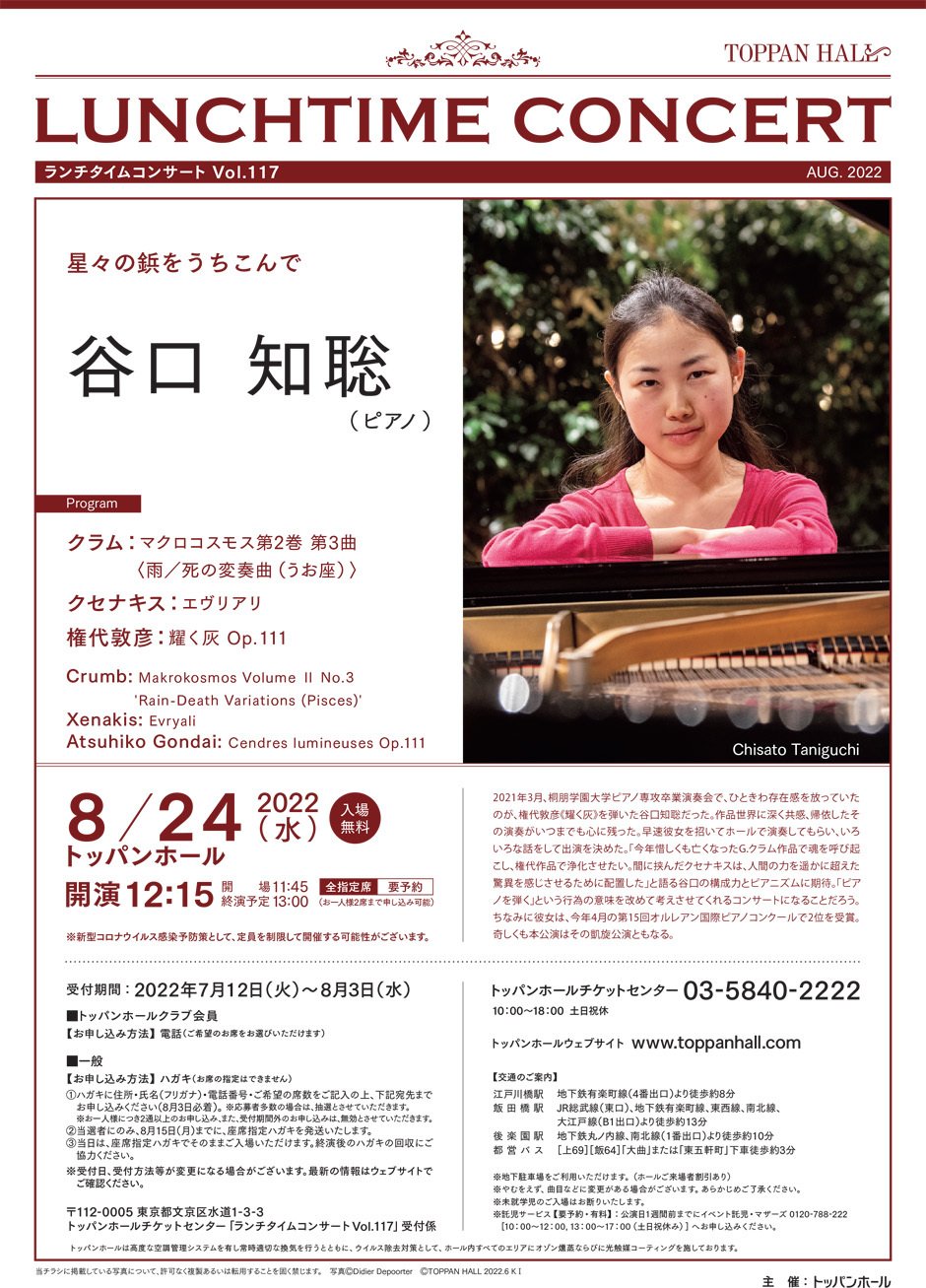 | Contact | トッパンホールチケットセンター 03-5840-2222(平日10:00~18:00) |