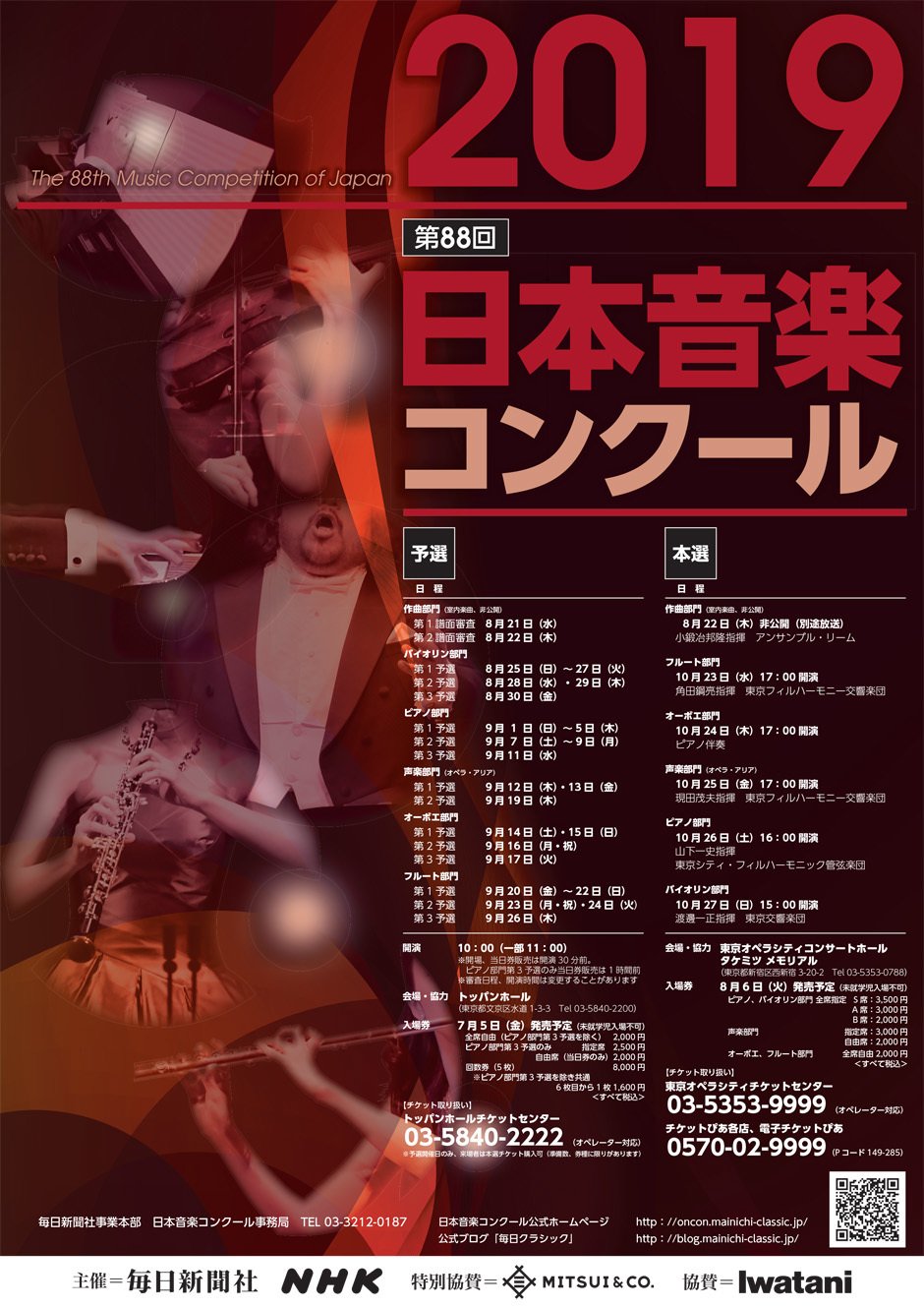 | Contact | お問い合わせ: 日本音楽コンクール事務局 03-3212-0187 予選開催日事務局 03-3817-0152 チケットのお申込み: トッパンホールチケットセンター 03-5840-2222 |