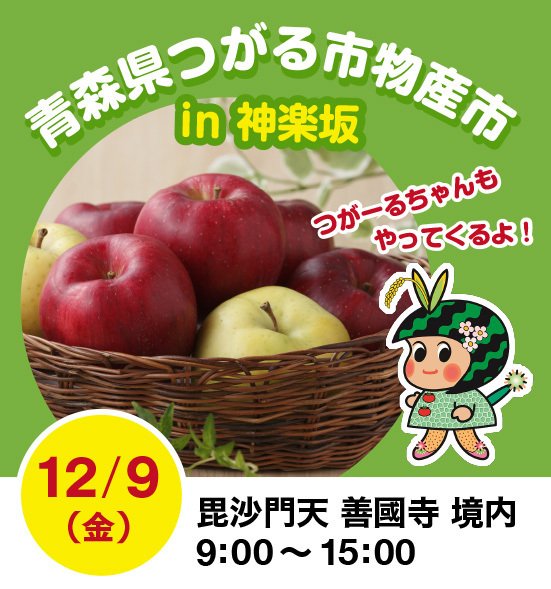 つがる市の特産品である農産物やブランド認定加工品などが買える物産市が、毘沙門天善國寺境内で開催されます。神楽坂では12月9日限りの市なので、この機会をぜひお見逃しなく!