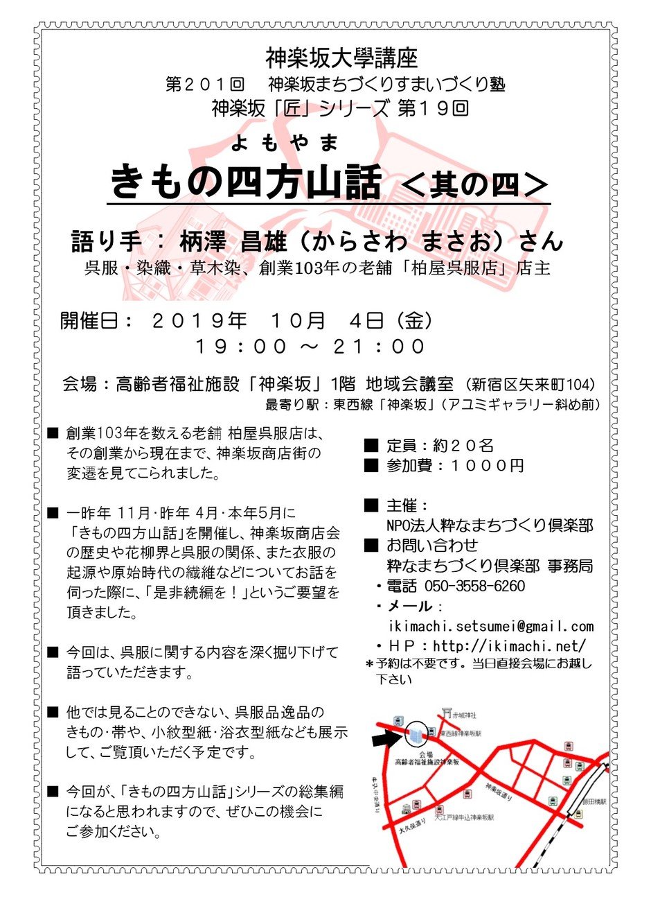 | Contact | NPO法人「粋なまちづくり倶楽部」塾事務局 ・電話 :050-3558-6260 ・メール:ikimachi.setsumei@gmail.com |