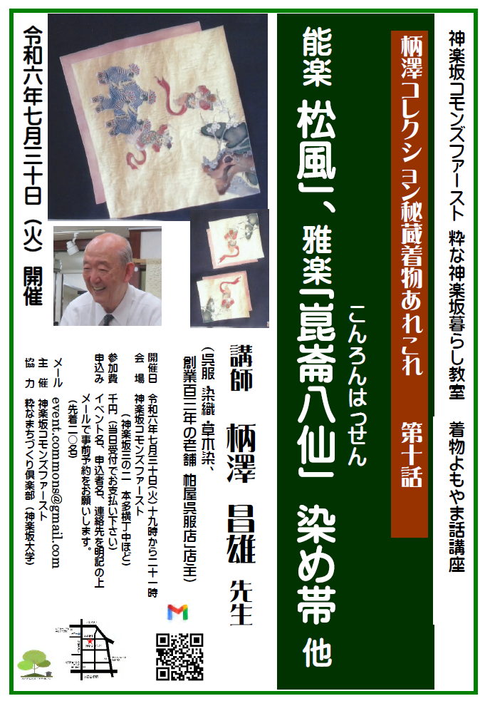 神楽坂コモンズファースト主催、粋なまちづくり倶楽部協力の、着物よもやま話講座「柄澤コレクション秘蔵着物あれこれ」第十話開催のお知らせです。