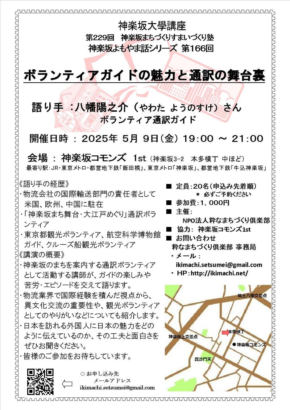 ・神楽坂のまちを案内する通訳ボランティアとして活動する講師が、ガイドの楽しみや苦労・エピソードを交えて語ります。